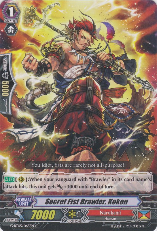 ...Wow. Just wow. Narukami once again gets one of the best commons in a set because good lord this thing can get really big, really fast. +3 for each hit your Vanguard makes in a deck that can punch up to six things means that even your Legion plays will allow your side lanes to hit for numbers that are normally seen when you drop Conquest Dragon. And yet there's more! Since this guy works when any Brawler VG hits he's effectively a 10k booster on turn 1 and afterwards so if your opponent stays Gradestuck at 2 then your Big Bangs can just swing at a side, kill it and now your 18000 Kokon + Slash Buster line just became 24000. Sticking this thing behind Chatura for 21000 VG swings every turn is no joke either.